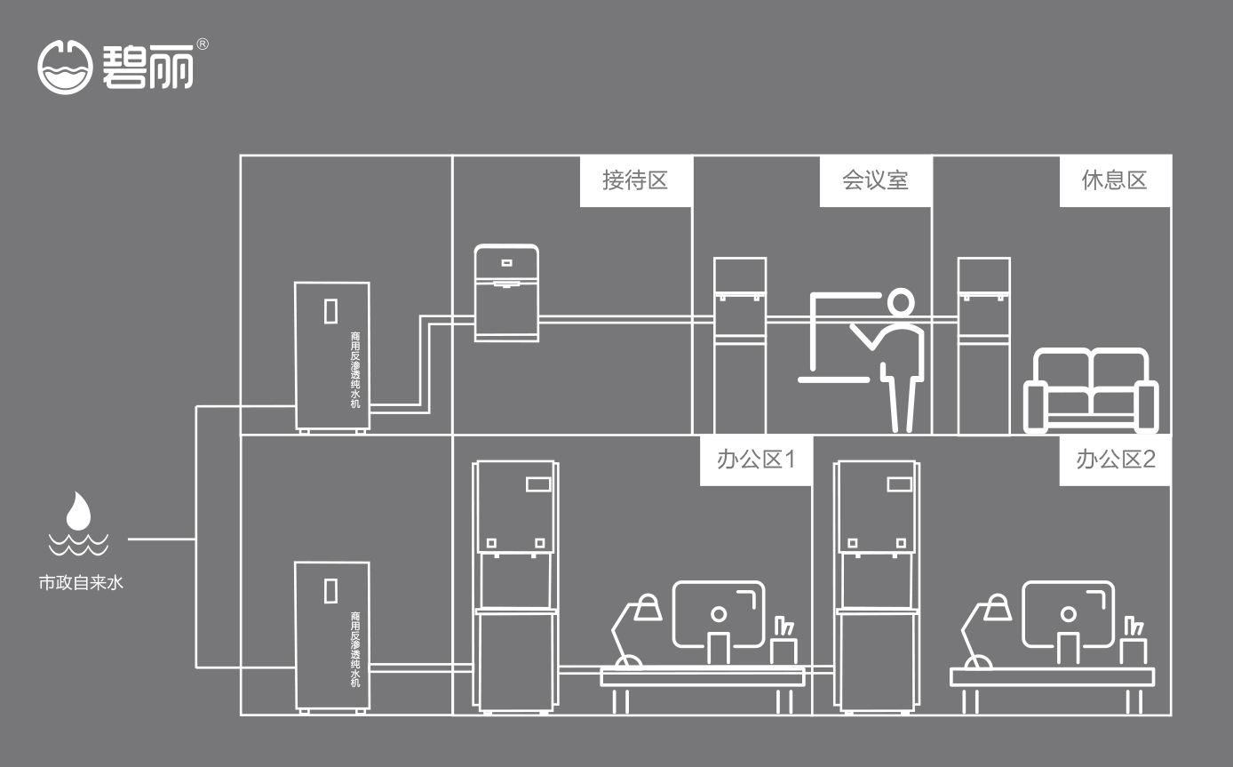 • 碧麗商用反滲透純水機將自來水集中處理后,把優(yōu)質(zhì)的純凈水通過專用的供水管道輸送到各飲水點;